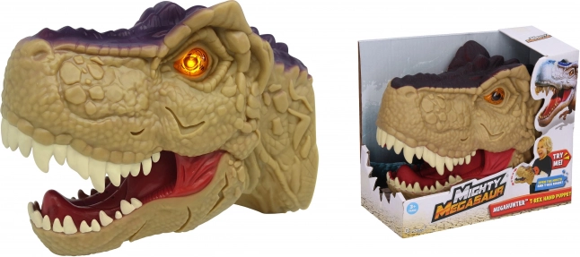 Dinosauří hlava s efektmi na ruku 20 cm. Zvukové a svetelné efekty, batérie súčasťou. Perfektná zábava pre deti.