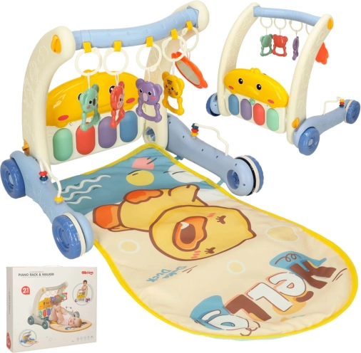 Multifunkčná 2v1 pre najmenších: edukačná hracia podložka s farebnými závesnými hračkami a stabilné chodítko s pianínkom a dvoma režimami. Hračka rastie s dieťaťom – od času na brušku až po prvé krôčiky, rozvíja motoriku, zrak, sluch aj koordináciu.