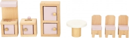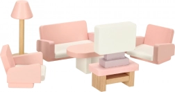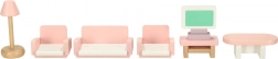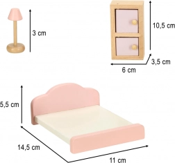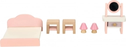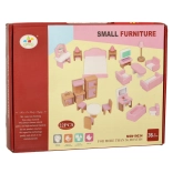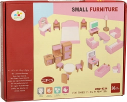 Štýlová sada dreveného nábytku pre domček bábik vybaví obývačku, spálňu, kúpeľňu aj kuchyňu. Kvalitné prírodné drevo, bezpečné farby v ružovej a bielej, spolu 22 dielov. Podporuje kreativitu, priestorovú predstavivosť a učenie hrou už od 3 rokov.