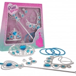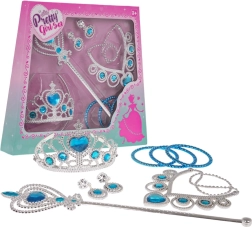 Táto bohato vybavená sada premení každé hranie na čarovný príbeh. Lesklé plastové „diamanty“ a napodobeniny drahých kameňov v strieborno‑modrom prevedení dodajú každému princeznovskému outfitu šmrnc. Doplnky sú navrhnuté s dôrazom na detailné spracovanie a pohodlné nosenie.