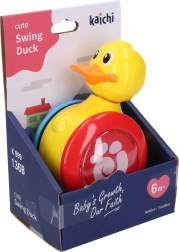 Farebná kačka na kolieskach zaujme pozornosť detí vďaka kolísavému pohybu a hrkajúcemu zvuku malých guľôčok.