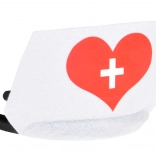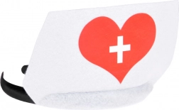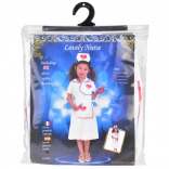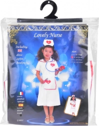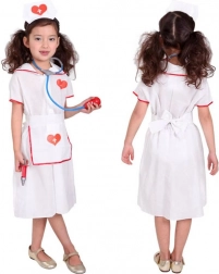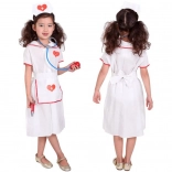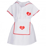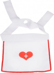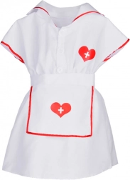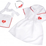 Biele šaty s červenými lemami, srdiečka s krížom a zástierka vytvárajú klasický vzhľad zdravotnej sestričky, ktorý deti milujú.