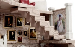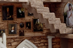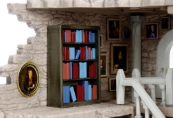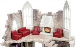 Malý model miestnosti so starobylým kameňom a gotickými oblúkovými oknami. Červené kreslá okolo kozubu zdôrazňujú gotický štýl.