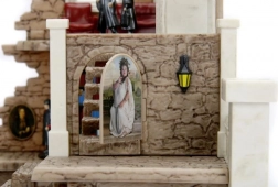 Kamená miniatúra hradu so stĺpmi a malou vonkajšou lampou, vhodná na vystavenie alebo hranie.