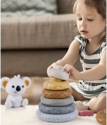 Okrem 13 senzorických stolov a kociek obsahuje sada tiež roztomilú hračku v tvare koaly, ktorú možno umiestniť na kocky, čo pridáva na zábave. Každý prvok sady je navrhnutý tak, aby dieťaťu poskytol rôznorodé senzorické a zvukové podnety vďaka vypuklým vzorom a delikátnym zvukom, ktoré kocky pri manipulácii vydávajú.
