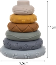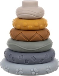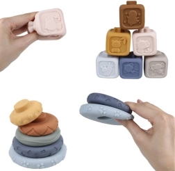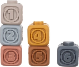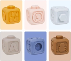 K dispozícii je 6 mäkkých kociek a krúžkov, ktoré vydávajú jemné zvuky a majú rôzne textúry, čo podporuje rozvoj zmyslov a motorických zručností.