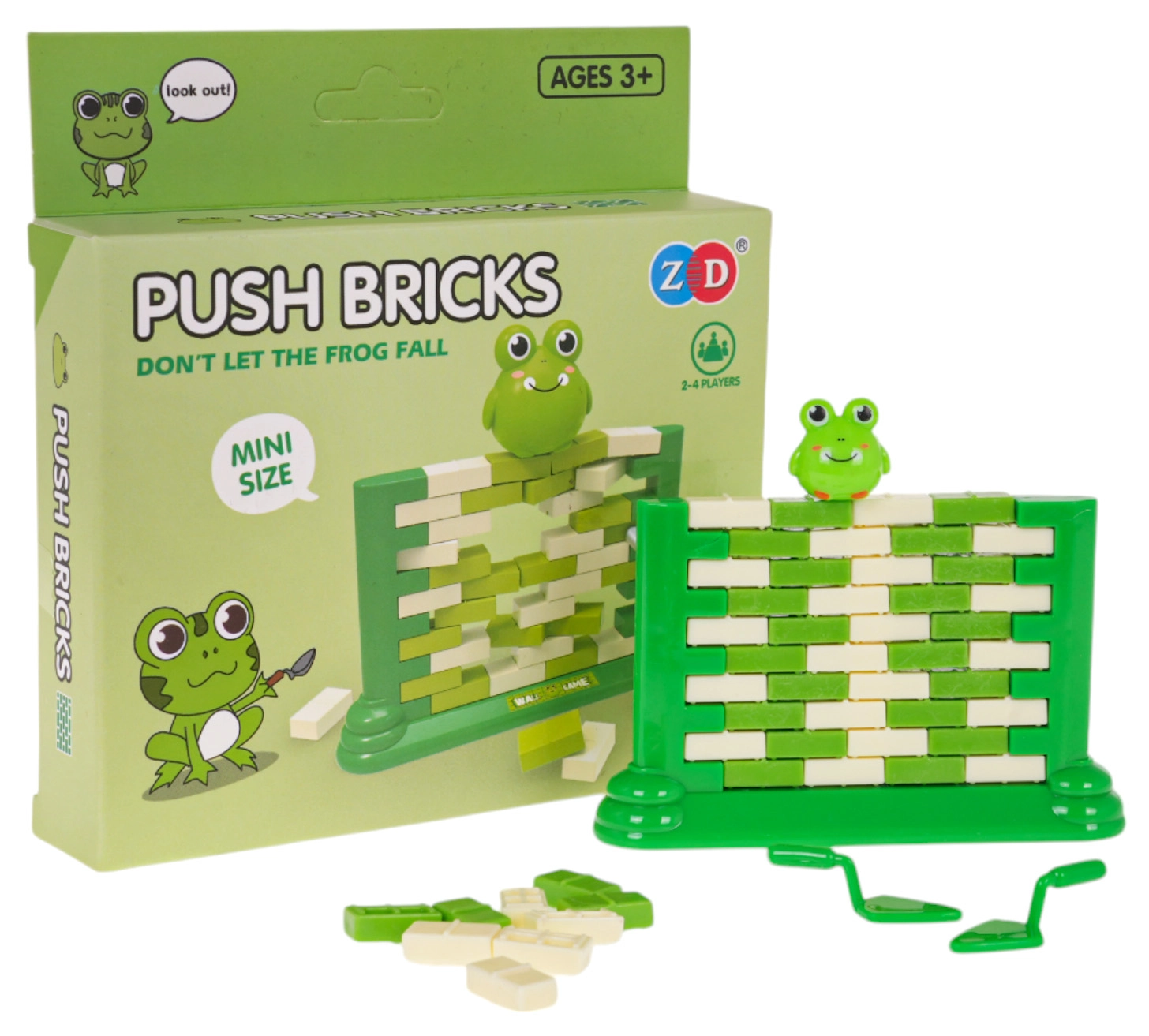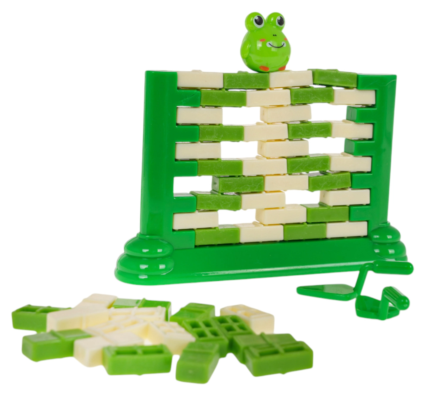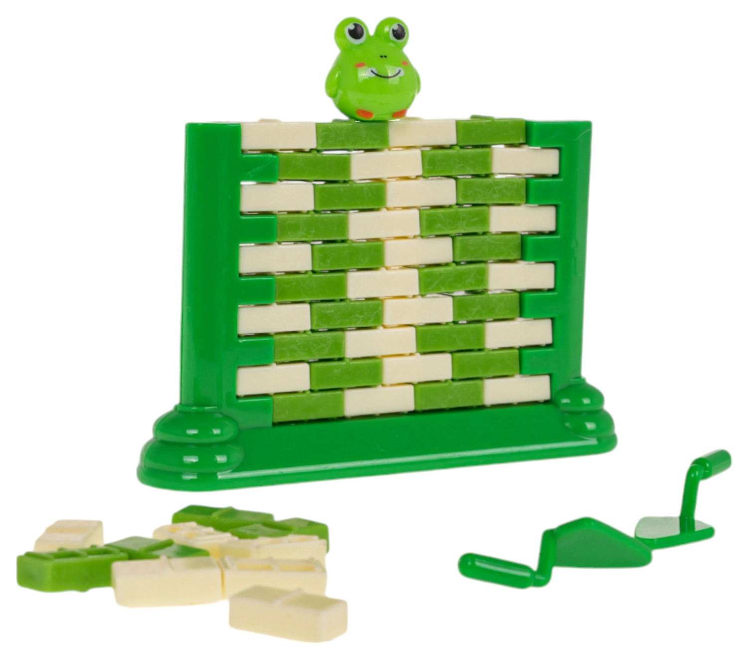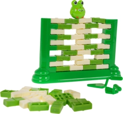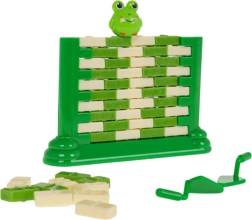 Zábavná zručnostná hra pre deti od 3 rokov, v ktorej staviame zo „tehličiek“ stenu a pomocou malej lyžice opatrne vytláčame jednotlivé dieliky. Na vrchole sedí figúrka žabky – úlohou je, aby nespadla. Hra rozvíja koncentráciu, logické myslenie a koordináciu ruka–oko, zároveň ponúka skvelú zábavu pre celú rodinu.