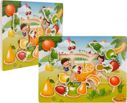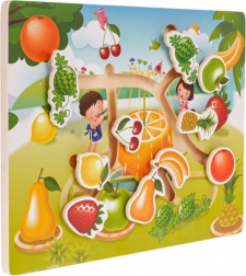 Táto drevená skladačka je navrhnutá pre najmenšie deti, ktoré chcú objavovať svet hračiek cez hru. Obsahuje farebné časti znázorňujúce rôzne druhy ovocia, ktoré sa vkladajú do drevenej dosky.
