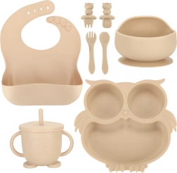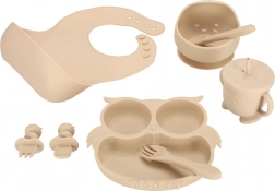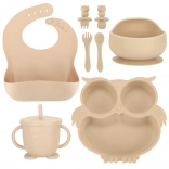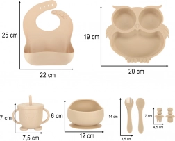 Kompletná silikónová sada na prvé samostatné stolovanie. Obsahuje tanier v tvare sovy, misku, hrnček so slamkou, podbradník a 2 páry príborov. Vyrobená z bezpečného potravinárskeho silikónu, s protišmykovou prísavkou na miske a tanieri, ergonomickými príbormi pre malé ruky a podbradníkom s vreckom pre menej neporiadku.
