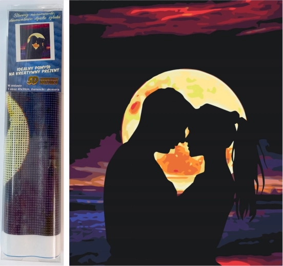 Diamantové maľovanie – postup: Horná strana plátna je potiahnutá lepidlom a prekrytá priehľadnou fóliou. Fóliu snímajte postupne po častiach tak, ako budete aplikovať kamienky. Pri zložení celej fólie naraz sa môže lepiaca vrstva znečistiť a kamienky nemusia tak dobre držať. Plátno obsahuje znaky, ktoré sú uvedené v priloženej legende a odkazujú na príslušné vrecúško s kamienkami označené číslom. Kamienky z daného vrecúška vysypte do misky. Do hrotu pera naberte vosk, vďaka ktorému sa kamienky ľahko prichytia na pero. Kamienky perom nanášajte na obrázok. Po nalepení danej farby kamienky nasypte späť do vrecúška a pokračujte s ďalšou farbou.