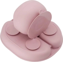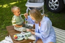 Zvýšené okraje riadu MoMi AMI uľahčujú dieťaťu naberanie jedla na príbory a trojdielny tanier pomáha rozdeliť jedlo na porcie. Protišmykové prísavky pod miskou a tanierom ich bezpečne udržia na stole alebo na podnose jedálenskej stoličky.