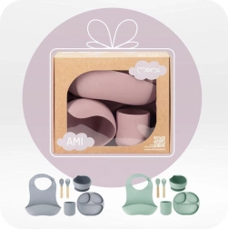 MoMi AMI je sada riadu, ktorá má deťom pomôcť naučiť sa jesť samostatne. Sada obsahuje: misu a tanier s prísavkami, hrnček, príbor s drevenými rukoväťami a pohodlný a mäkký podbradník s vreckom. Riad MoMi AMI je vyrobený zo silikónu, ktorý je bezpečný pri kontakte s potravinami. Neobsahuje BPA ani ftaláty. Riad je dodávaný vo farebnej darčekovej krabičke!