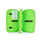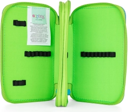 Užívateľský komfort zaisťuje kvalitný zips s veľkými tiahadlami na jednoduchú manipuláciu a priehľadné vrecko na týždenný rozvrh v jednom poschodí. Praktické 25-dielne gumové úchyty držia písacie potreby bezpečne na svojom mieste.