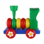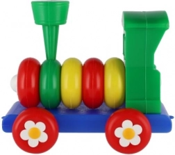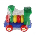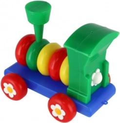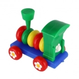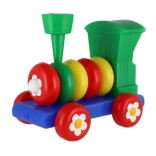 Vláčik je vyrobený z plastu vo výrazných farbách, ktoré priťahujú pozornosť detí, a zdobený kvetinovými motívmi na kolesách.
