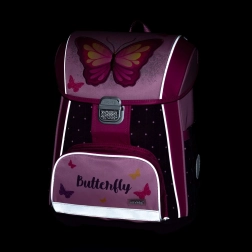 Štýlová školská aktovka s motívom motýľov spája atraktívny dizajn a dôraz na zdravé nosenie. Anatomicky tvarovaný chrbát s priedušným polstrovaním a široké mäkčené popruhy zaisťujú pohodlie aj pri každodennom nosení. Pevné dno a vnútorná výstuž držia tvar tašky a chránia obsah pred prevrátením a vysypaním.