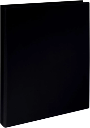 Elegantný katalógový zakladač formátu A4 v čiernej farbe, vybavený priehľadným vreckom na prednej strane i chrbte. Ponúka praktickú 4-krúžkovú mechaniku s krúžkami tvaru "D" pre efektívnu archiváciu dokumentov.