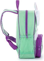 Praktické členenie uľahčí organizáciu: hlavná komora na väčšie veci, predné vrecko na desiatu a sieťované bočné vrecká na fľašu s pitím. Nastaviteľné popruhy a mäkké polstrovanie prispievajú k pohodliu pri každodennom nosení, zatiaľ čo hravý zajačí motív podporuje detskú fantáziu.