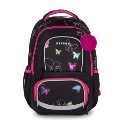 Školský batoh OXY NEXT Butterfly kombinuje moderný dizajn s motýlími motívmi a praktickú výbavu do školy aj na krúžky. Ergonomicky tvarovaná zadná časť, mäkké ramenné popruhy a nastaviteľný hrudný popruh rozkladajú záťaž a prispievajú k zdravému držaniu tela.