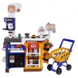 Súčasťou je tiež veľký nákupný vozík na kolieskach a bohaté príslušenstvo: ovocie, zelenina, pečivo, nápoje, mliečne výrobky, mince a bankovky, platobná karta aj maketa telefónu. Deti si vyskúšajú rôzne formy platenia – v hotovosti, kartou aj telefónom – a precvičia triedenie i počítanie.