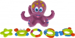Táto farebná kúpacia hračka premení každé kúpanie na radostnú hru. Fialová chobotnica s úsmevom a päť odnímateľných krúžkov v tvare kraba, rybky, raka, hviezdičky a kolieska láka deti k objavovaniu a precvičovaniu zručností. Mäkký plast je príjemný do rúčky a šetrný k detskej pokožke.