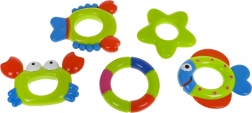 Sada obsahuje kraba, rybku, raka, hviezdičku a koliesko v pestrých farbách na rozvoj rozpoznávania tvarov a farieb.