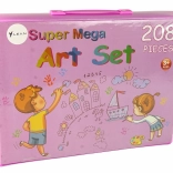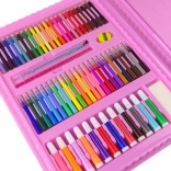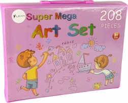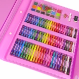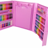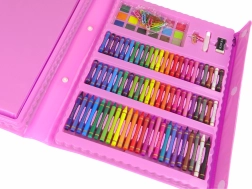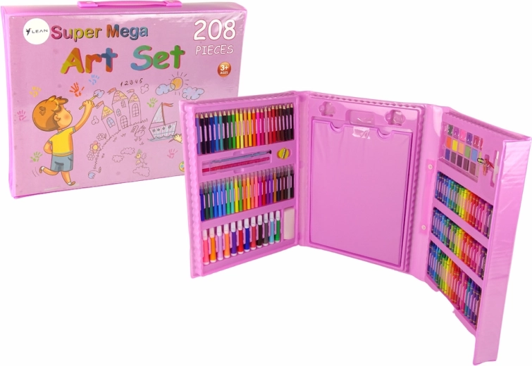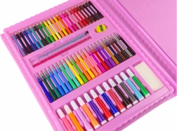 Tento ružový výtvarný kufrík ponúka bohatú paletu nástrojov pre malých umelcov: fixky, pastelky, voskovky, olejové pastely, akvarelové farby a praktické pomôcky. Vďaka prehľadnému usporiadaniu má dieťa všetko po ruke a môže sa naplno sústrediť na tvorbu.