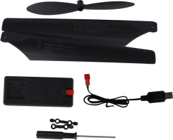 - RC vrtuľník, diaľkový ovládač, USB nabíjačka, náhradná vrtuľa, skrutkovač, návod na použitie, originálne balenie