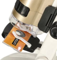 Mikroskop je postavený na stabilnej základni s LED lampičkou, ktorá zabezpečuje rovnomerné osvetlenie. Vďaka dvom stupňom zväčšenia – 100x a 250x je možné pozorovať štruktúry vlákien, buniek a iných materiálov do najmenších detailov.