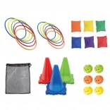 Súbor športových hier 3 v 1 je univerzálna sada, ktorá poskytuje množstvo aktívnej a kreatívnej zábavy doma aj na záhrade. Pozostáva z kužeľov, ktoré slúžia ako terče, a troch rôznych predmetov na hádzanie: obručí, vrecúšok a lôpt. Vďaka tejto rozmanitosti umožňuje sada mnoho foriem hry – od klasických zručnostných hier až po vymýšľanie vlastných výziev a úloh.