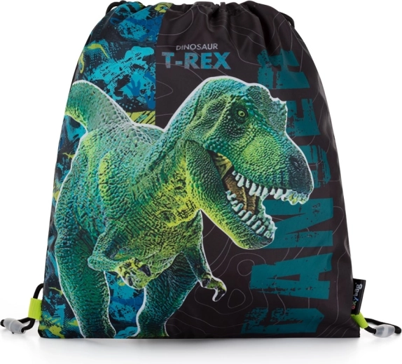 Štýlový sáčok na cvičky s motívom dinosaura je ideálnym riešením na ukladanie športovej obuvi alebo drobností. **Uzavretie stiahnutím šnúrok** zaručuje jednoduchú obsluhu, zatiaľ čo **možnosť nosiť na chrbte alebo pripevniť k školskému batohu** poskytuje praktické použitie na dennej báze. **Vyrobený z 100% polyesteru**, sáčok zaručuje trvanlivosť a jednoduchú údržbu.