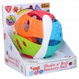 Zábavná vkladacia guľa Playgo s priemerom 15 cm prináša deťom od 12 mesiacov množstvo zmyslovej zábavy. Súčasťou sú 2 mäkké loptičky, ktoré sa vkladajú do gule, a stuha s otočným kolieskom, ktoré pri otáčaní vydáva cvakajúci zvuk.