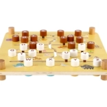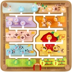 Šikovná a zábavná pomôcka pre predškolákov: obojstranná doska ukrýva dva svety. Na farme deti posúvajú kolíky so zvieratkami, tvárami a ovocím po vyfrézovaných dráhach na ich miesto. Otočením dosky sa zmení na abecedný labyrint – úlohou je doviesť kolík s počiatočným písmenom k správnemu zvieratku (názvy sú v angličtine), takže sa hravo precvičia písmená aj slovná zásoba.