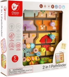 Obojstranný drevený labyrint 2 v 1 od značky CLASSIC WORLD spája hru a učenie: z jednej strany farma so zvieratkami, z druhej strany abeceda so zvieratkami. Deti trénujú jemnú motoriku, logické myslenie a sústredenie, keď vedú kolíky labyrintom na správne miesta. Kvalitné drevené prevedenie, rozmer 30 × 30 cm, vhodné od 3 rokov.