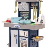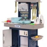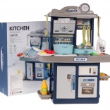 Štýlová detská kuchynka v modrom prevedení prináša svetelné a zvukové efekty, tečúcu vodu z kohútika a bohatú sadu 35 doplnkov pre realistické varenie. Pevná konštrukcia, interaktívna varná doska s podsvietením a zvukmi vyprážania či varenia, otváracia rúra aj chladnička podnecujú kreatívnu hru a rozvoj predstavivosti detí od 3 rokov.