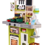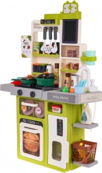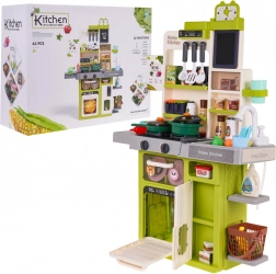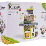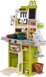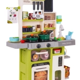 Bohato vybavená, veľká multifunkčná kuchynka pre deti staršie ako 3 roky. Kuchynka má drez s kohútikom, z ktorého tečie voda, osvetlené horáky so zvukmi varenia a vyprážania, jeden z horákov má funkciu pary, pohyblivé gombíky, otvárateľnú rúru, otvárateľnú chladničku, hodiny s pohyblivými ručičkami, police a početné kuchynské doplnky (63 kusov). Sada je napájaná 3 batériami AA 1,5 V (nie sú súčasťou balenia). .. Funkcie kuchynky: . - vhodné pre deti od 3 rokov, .- vyrobené z najkvalitnejšieho plastu, .- vydáva zvuky vyprážania a varenia, .- osvetlené horáky, .- pohyblivé gombíky, .- para z horáka, .- voda z vodovodu, .- chladnička s otváracími dverami, .- rúra s otváracími dverami, .- 2 x otváracia skrinka, .- hodiny s pohyblivými ručičkami, .- odnímateľná tabuľa na kreslenie kriedou. |