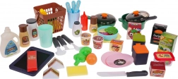 - veľká kuchynka, .- tabuľa, .- tabuľa, .- huba, .- hrniec s pokrievkou, .- panvica s pokrievkou, .- kôš, .- misa, .- 2 x hrnček, .- čajová kanvička, .- soľnička, .- 2 x nádoba na korenie, .- korenička (pepřenka), .- sójová omáčka, .- pálivá omáčka, .- kyslá omáčka, - kečup, .- 2 x džem, .- 2 x sendvič, .- 2 x tanier, .- 1 x tanier, .- uhorka, 5 plátkov papriky, banán, 2 plátky mrkvy, mrkva, 2 listy šalátu, 2 x hrášok, 2 plátky cibule, 2 plátky brokolice, kukurica, zemiak, hruška, .- lyžica, vidlička, nôž, .- naberačka, cedník, špachtľa, lyžica na cestoviny, sekáčik, .- umývací prostriedok, .- kartóny mlieka, džúsu, sušienok, hamburgerov, hamburgerov, .- sada samolepiek. . |
