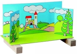 Magnetické divadlo s motívom hradu premení stôl na malé javisko, kde deti ľahko rozhýbu postavy pomocou magnetických vodiacich paličiek. Drevené figúrky s vlepeným magnetom plynulo jazdia po scéne a vďaka dvom sadám kulís môžu príbehy ľahko obmieňať.