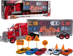 Veľká sada pre malých vodičov: červený kamión s odpojiteľným návesom, ktorý slúži ako praktický kufrík na 6 autíčok. Súčasťou sú aj dopravné značky a kužele pre realistickú hru. Hračka je vyrobená z odolných materiálov, má živé farby a je vhodná pre deti od 3 rokov.