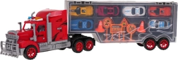 Objavte zábavu na cestách s veľkým kamiónom, ktorý v priehľadnom návese preváža 6 farebných autíčok a sadu dopravných značiek. Zadné dvere návesu sa otvárajú a vytvárajú nájazdovú rampu pre plynulé vychádzanie vozidiel. Po odpojení sa náves premení na kufrík s pohodlným uchom, takže si deti môžu svoj vozový park vziať kamkoľvek so sebou.