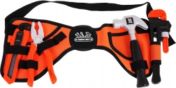 Textilný opasok s pútkami a vreckami pojme kompletnú výbavu – deti majú kladivko, kliešte či skrutkovač vždy po ruke. Maximálny obvod približne 84 cm.