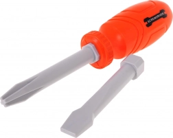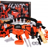 Kladivo, kliešte, nastaviteľný kľúč, nôž, skrutkovač s nadstavcami, skrutky, hmoždinky aj dieliky na skrutkovanie – ideálne na tréning jemnej motoriky a role-play.