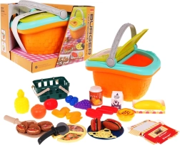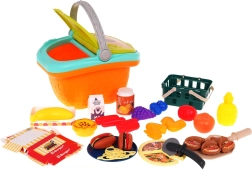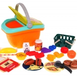 Súčasťou je veľký kôš s uškom a menší košík, pestrý výber plastových potravín (ovocie, zelenina, pečivo, mäso, dezerty) a praktické príslušenstvo ako tanierik, lopatka na pizzu a krájacie koliesko. Vďaka robustnému prevedeniu a detailnému spracovaniu je set ideálny na zábavu vonku aj hraní doma.