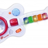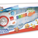 Svetelné efekty dodávajú zábavnosť a energiu pri každom hraní. Napájanie zabezpečujú 3 R6 / AA 1,5V batérie, ktoré nie sú súčasťou balenia. Gitara je vhodná pre deti od 1,5 roka a má rozmery 17 x 40 x 5 cm.