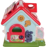 Objavte zábavný spôsob, ako deti zoznámiť s hudbou, tvarmi a farbami. Interaktívny domček kombinuje pianinko s 5 klávesmi (čísla, zvieratá a ich zvuky, melódie, tóny Do–So), svetelné okienko a hovoriace/hracie prvky so zvieratkami. Každá stena ponúka inú aktivitu – od otváracích dvierok na kľúčik po ozubené kolieska a otáčacie bloky s písmenami.