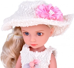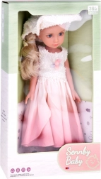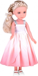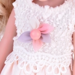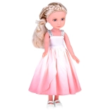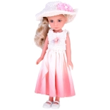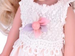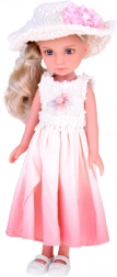 Táto bábika má dlhé blond vlasy zapletené do elegantného vrkoča a je oblečená v pôvabných koktejlových šatách v odtieňoch ružovej so striebornými ramienkami. Je ozdobená jemným kvietkom a nosí krémové bolerko. Na hlave má štýlový krémový klobúk, ktorý jej dodáva čaro a eleganciu, a na nohách má biele topánočky. Vyzerá jednoducho rozkošne!