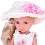 Bábika má elegantné šaty a klobúk, ktoré dodávajú štýl a vkus, ideálne na módne prehliadky aj ako dekorácia.