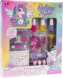 Kúzelná sada na nechty a líčenie s motívom jednorožca poteší každú malú parádnicu od 3 rokov. Obsahuje trblietavé laky na nechty, očné tiene so štetčekom, lesk na pery v krabičke v tvare jednorožca, nálepky na nechty, pilník, separator prstov, aplikátor s trblietkami a rúž. Všetky kozmetické produkty sú bezpečné pre deti a ľahko umývateľné.