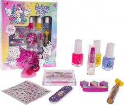 Obsah balenia: 3× trblietavý lak na nechty, rúž, aplikátor s trblietkami, pilník na nechty s jednorožcom, separator prstov, paletka očných tieňov (6 farieb) so štetčekom, lesk na pery v krabičke v tvare jednorožca, dekoratívne nálepky na nechty.