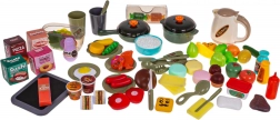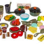 Hrniec, panvica, príbory, tanieriky, potraviny na suchý zips, nápoje, koreniny, kriedová tabuľka a samolepky – všetko pre kreatívne varenie.