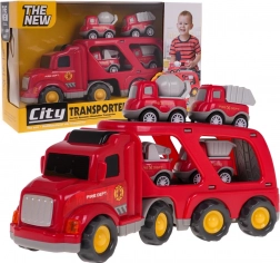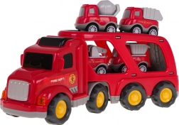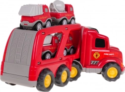 Táto detailne spracovaná sada hasičských vozidiel prináša deťom dlhé hodiny kreatívnej zábavy. Veľký transportný kamión s odpojiteľným prívesom odvezie hneď štyri menšie pracovné vozy. Po stlačení tlačidla na streche kabíny sa rozsvietia predné svetlá a ozvú sa autentické zvuky štartovania, jazdy aj klaksónu.